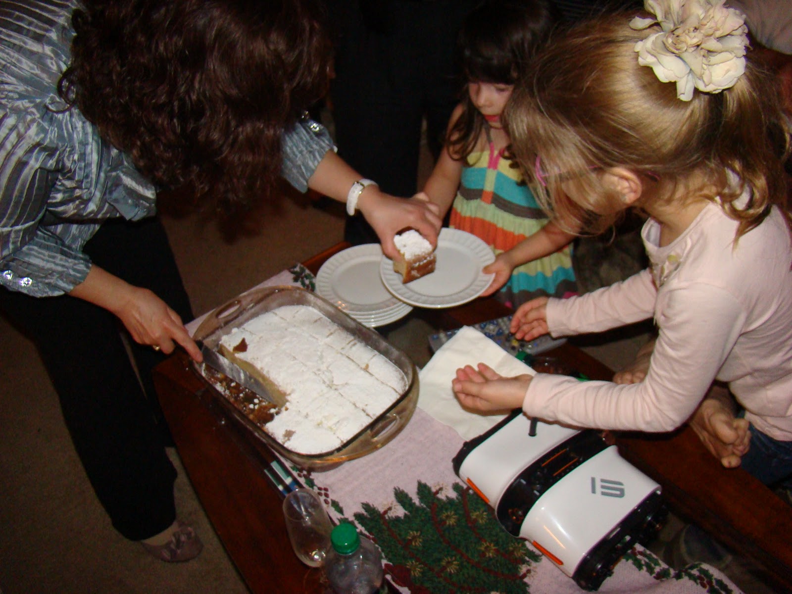 New Years Eve this year was spent at Yia Patra and Papou' Vassilis house. We had the traditional Greek cake. The tradition goes that you bake a cake with a coin hidden inside. Once you cut and serve it, whomever get the piece with the coin is said to have good luck in the coming new year. If no one gets it, then the luck goes to the home the cake is cut in. This year, Papou' Vassili was the lucky winner. Cronia Pola Vassili!