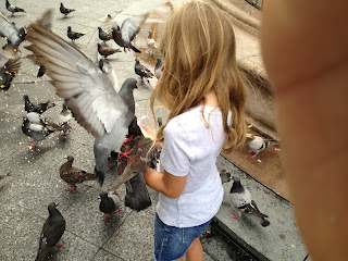 San Juan came in a close second as my favorite port for several reasons, but there was a stand out. A quaint restaurant in the old downtown San Juan had the best skirt steak with rice and beans I've ever eaten. And, I'll never forget the Mojitos! It was the perfect meal. The architecture of this city was AMAZING. Everywhere I looked, I saw beautiful arches and colorful tiles. The main square had 100's of pigeons waiting for a handout. The kids were happy to throw seed to them and have the birds land on their arms. It kind of freaked Steven out, so he threw out all of his seeds at once. Amanda Lily loved it. She wasn't scared of the birds one bit and took her time trying to be sure everyone got in on the feast.